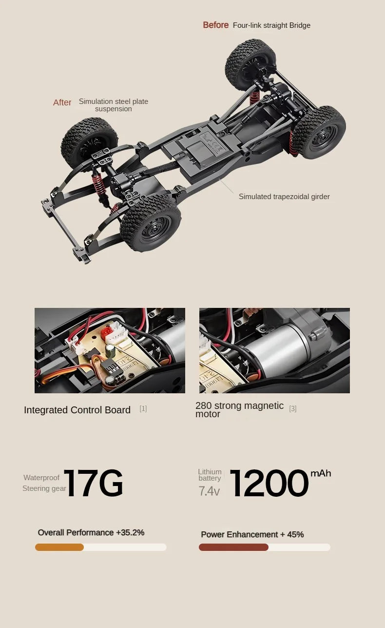 Rugged structure with anti-slip tires, 4 suspension springs, a 4 cm clearance, and climb-ready design deliver stable performance on sand, grass, rocks, and mud. -