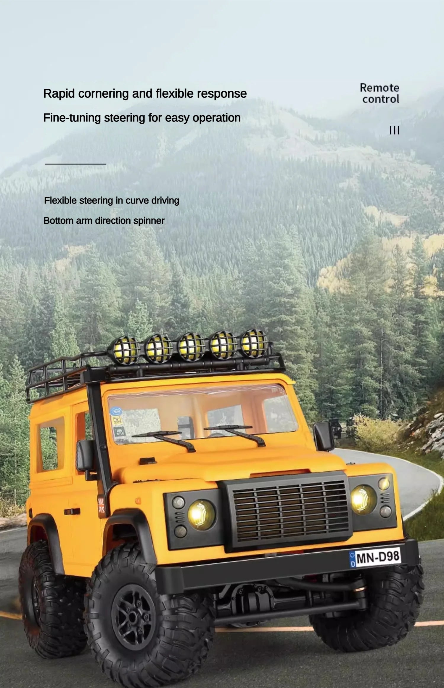 Hit the trails with the MN98 1:12 Land Rover Defender RTR RC Car – a rugged, realistic, and ready-for-adventure remote control vehicle! Styled after the iconic Land Rover Defender, this RC truck comes in a bold and eye-catching yellow and grey finish, combining authenticity with performance for RC fans of all ages.